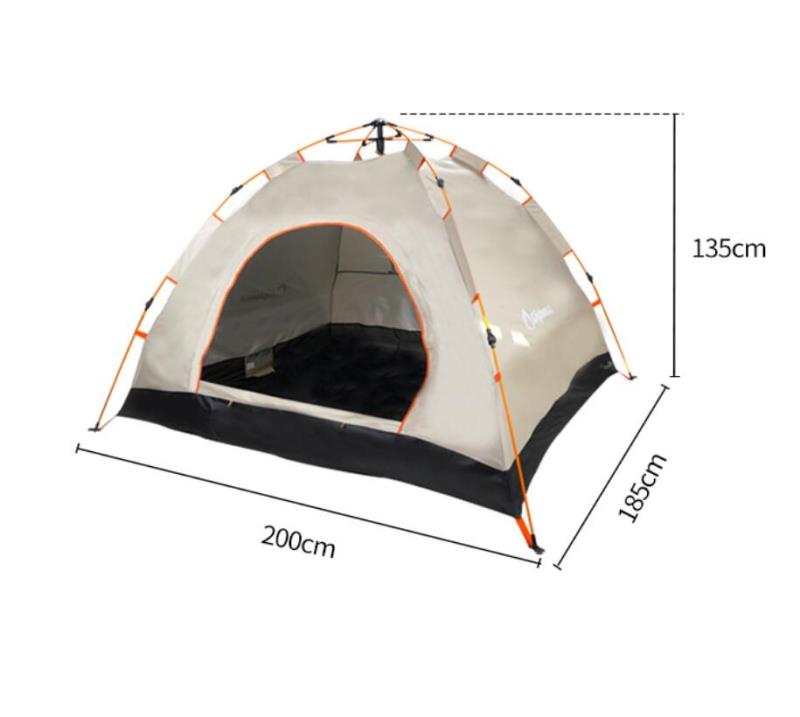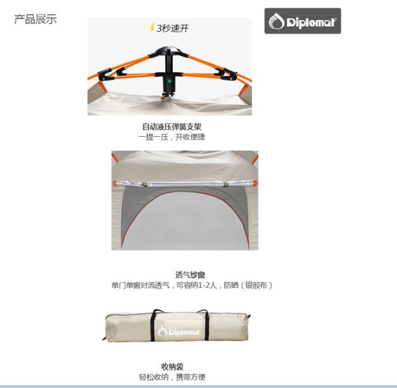 全新自動彈簧式科技,一提一壓,開收便捷。單門單窗設計,可容納3-4人。門簾上半部紗窗設計,防蚊透氣。帳面及底帳防潑水,便于清理。防曬指數達到UPF30+(銀膠布),效果顯著。配4根地釘,戶外防風更牢固。支架與帳面配色,專注品質細節。
