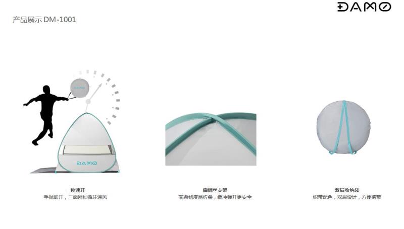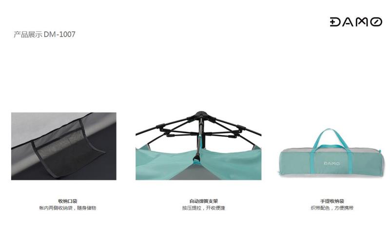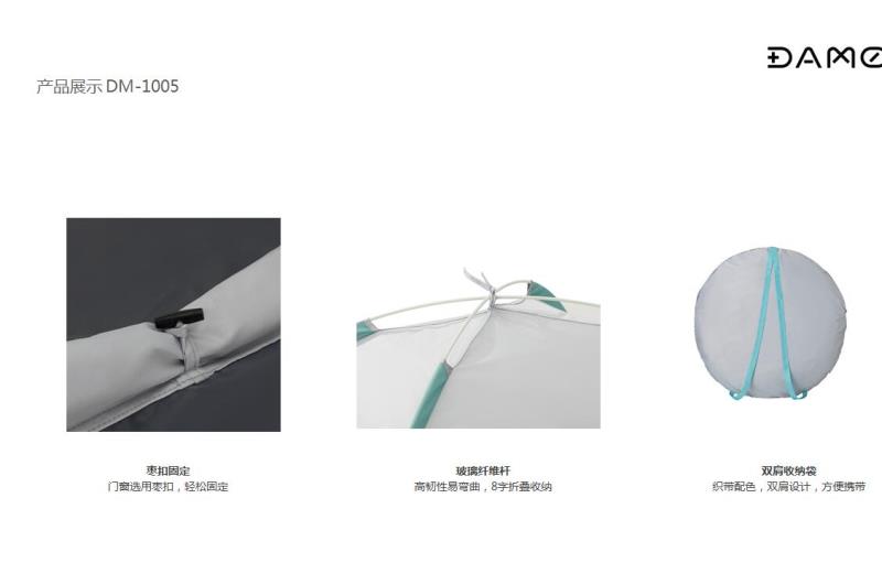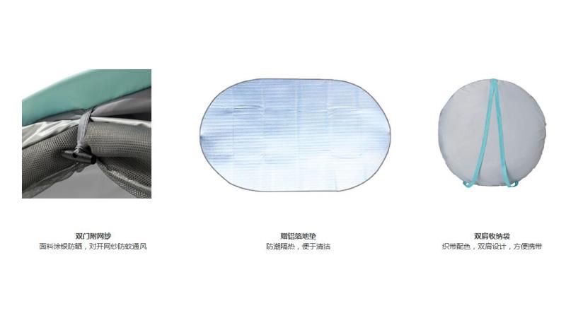 兩門附帶兩紗窗,通風透氣。防風繩可連接門幅織帶,增加防曬面積。贈送專屬鋁膜地墊,隔熱防潮,方便清潔。收納袋雙肩配色背帶,便于攜帶。一秒速開,