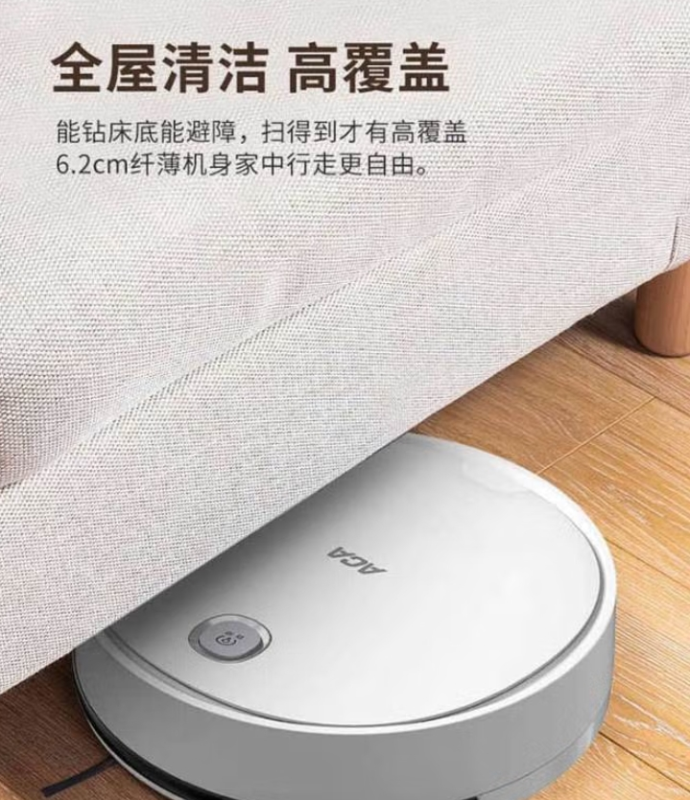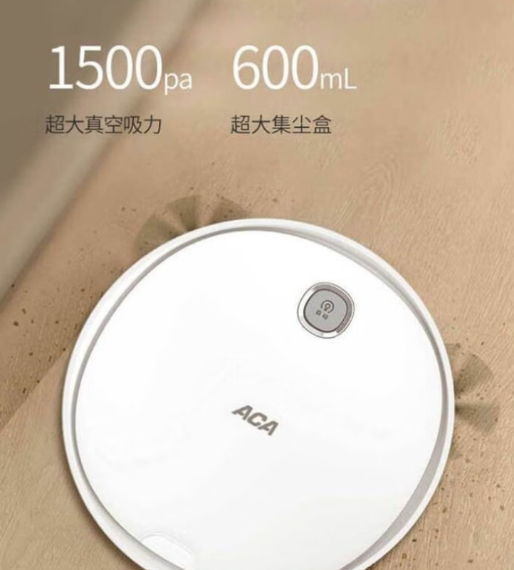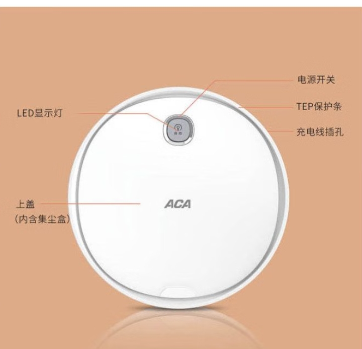 ACA全自動智能吸塵器 一鍵傻瓜式操作 無需看管值守 雙邊聚攏 加長6邊毛刷,清掃更徹底 掃吸一體 超大吸力,輕松吸起灰塵、紙屑和毛發等,大米、黃豆也毫無壓力 內置1800mAh大容量高效能電池 帶來超長待機體驗…