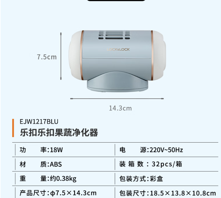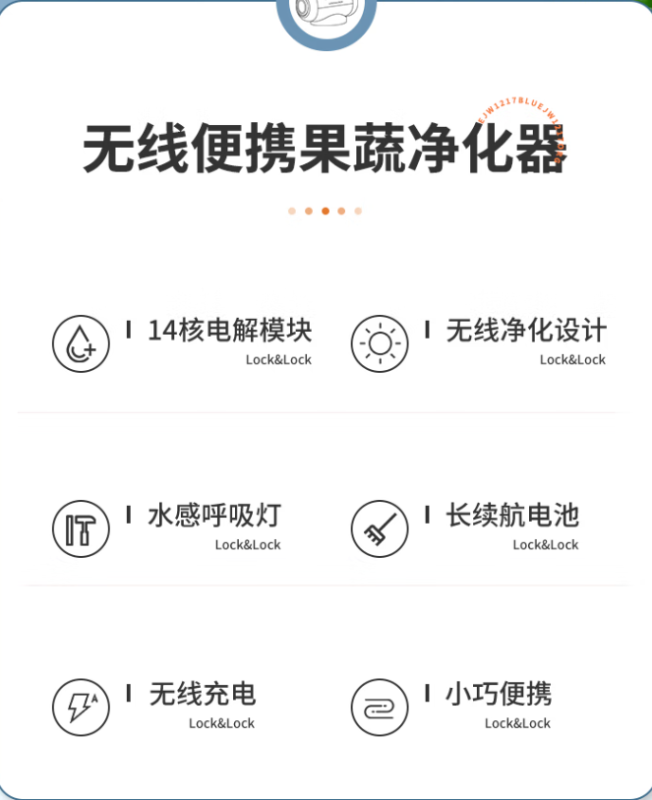 樂扣樂扣果蔬凈化器1、無線充電;2、智能水感呼吸燈;3、14核高濃電解模塊,凈化更徹底4、2000mAh大容量電池超長續航